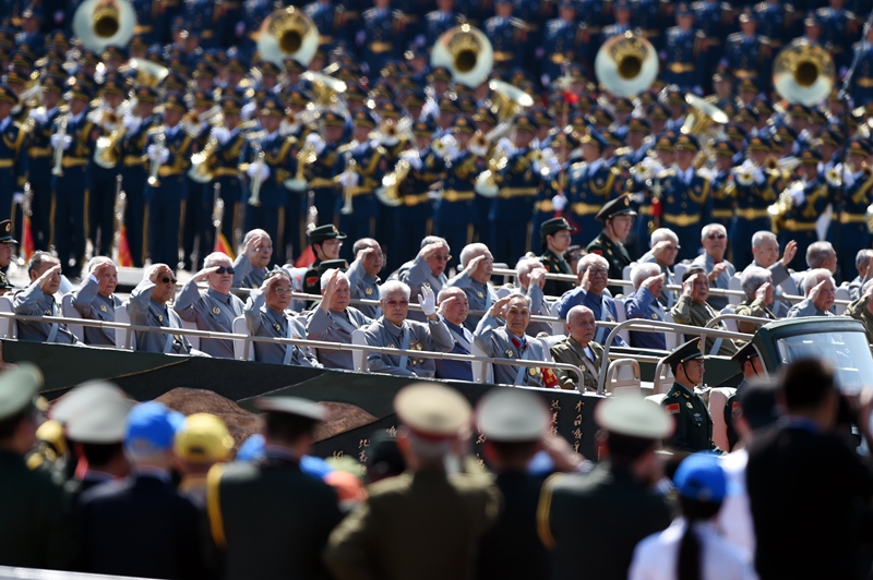 2015年9月3日,中国人民抗日战争暨世界反法西斯战争胜利70周年纪念大会在北京隆重举行。这是抗战老兵乘车方队通过天安门广场。新华社记者 王定昶 摄